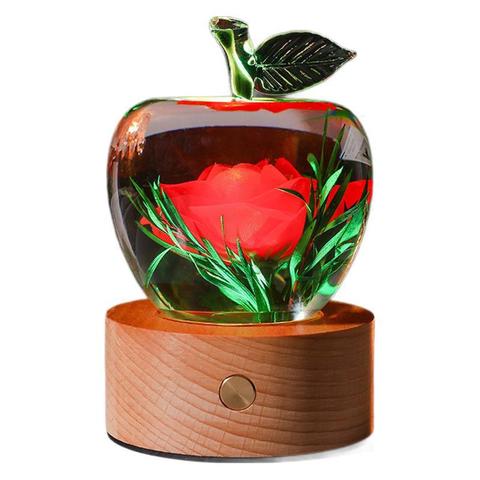 3D النقش بالليزر الكريستال التفاح ضوء الليل مع قاعدة خشبية ملونة أدى ضوء زهرة داخل زخرفة الزخرفية
